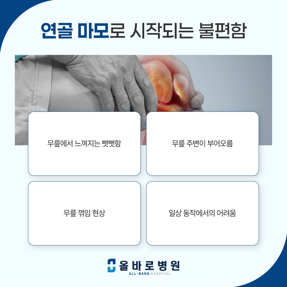 결국 연골이 사라지면 뼈끼리 직접 맞닿으며 자극이 심해지고, 뻣뻣함, 붓기, 무릎 꺾임 현상 등이 일어날 수 있습니다.