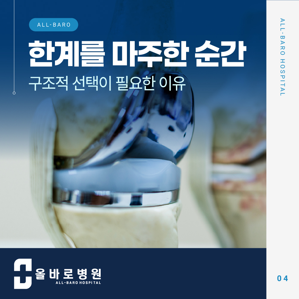 따라서 반복되는 무릎 불편함과 함께 일상 동작이 어려워지고 있다면, 지금이야말로 관절의 구조 자체를 다시 설계하는 결정을 고려해야 할 때입니다.