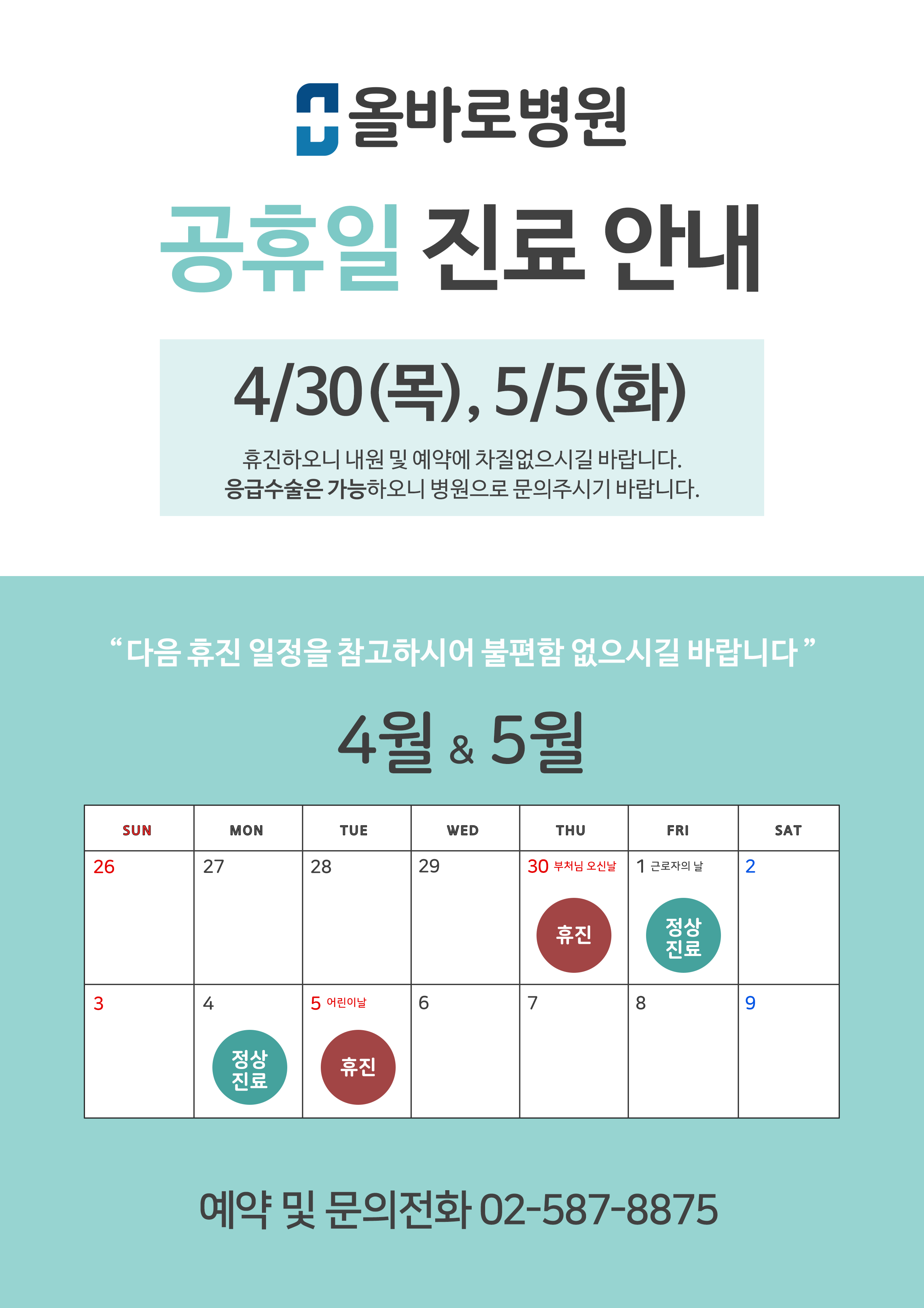 공휴일 휴진 안내 (부처님오신날 4/30, 어린이날 5/5)