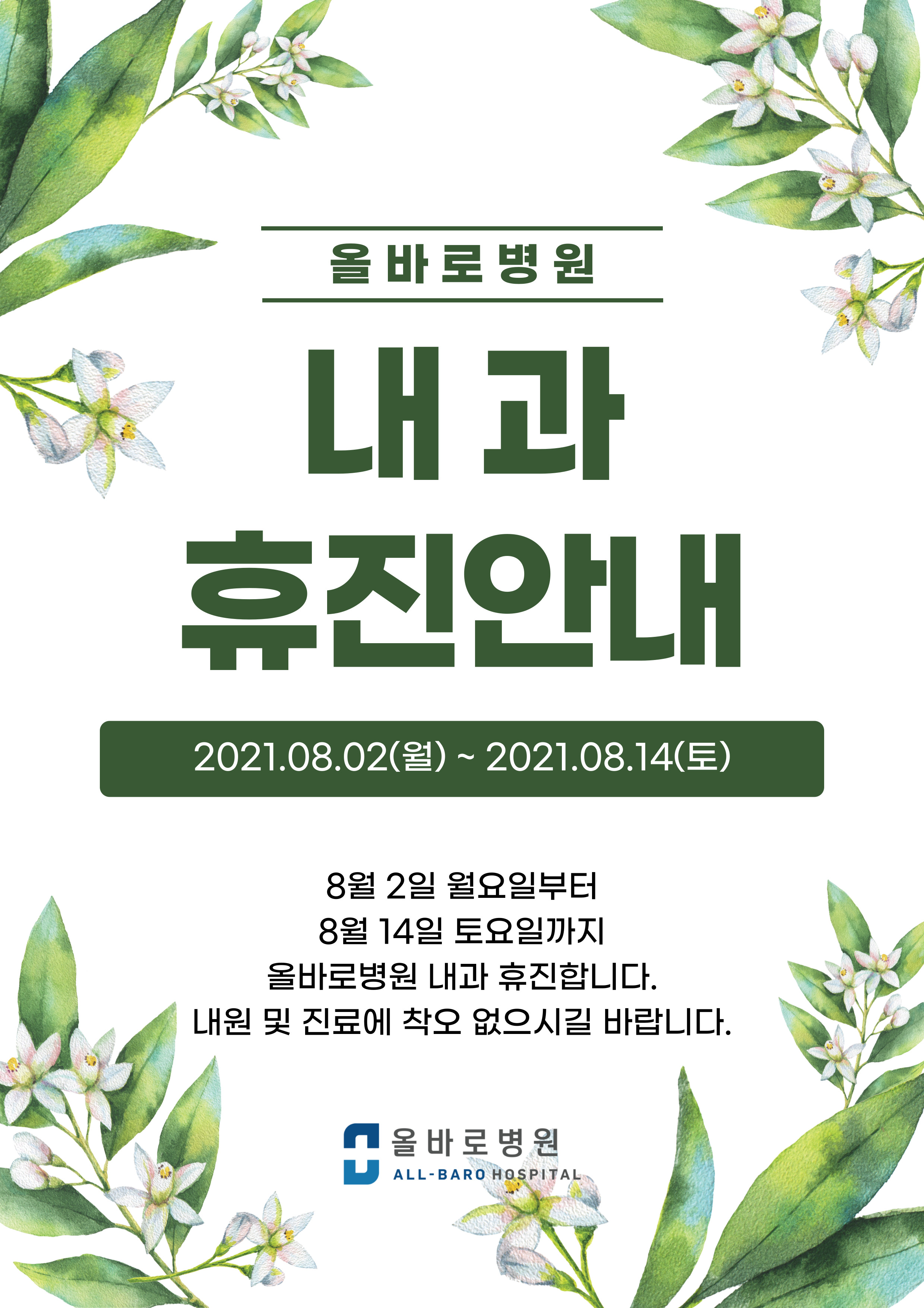 2021년 8월 2일 월요일부터 8월 14일 토요일까지 내과 휴진합니다.