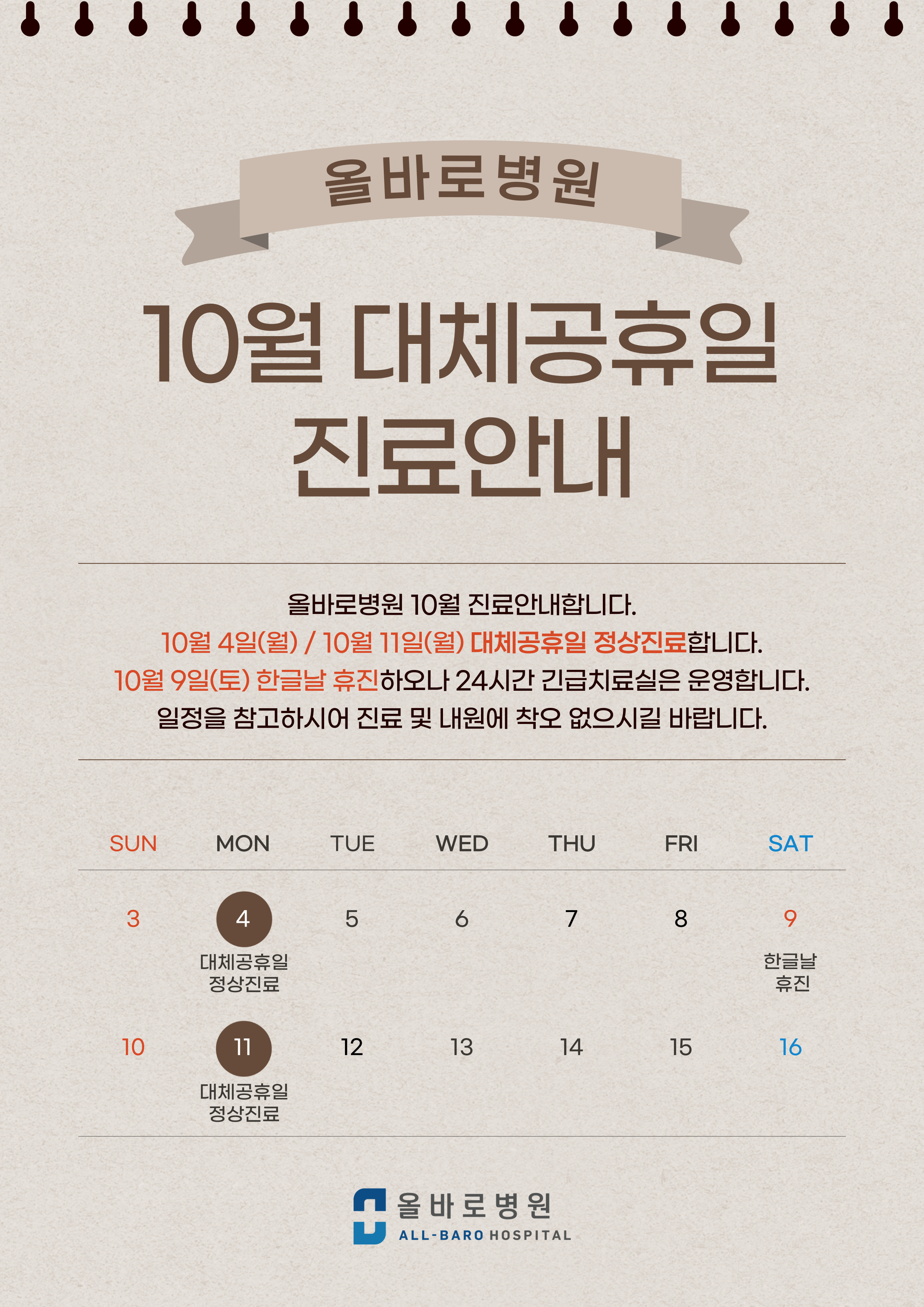 10/4(월), 10/11(월) 대체공휴일 정상진료합니다.