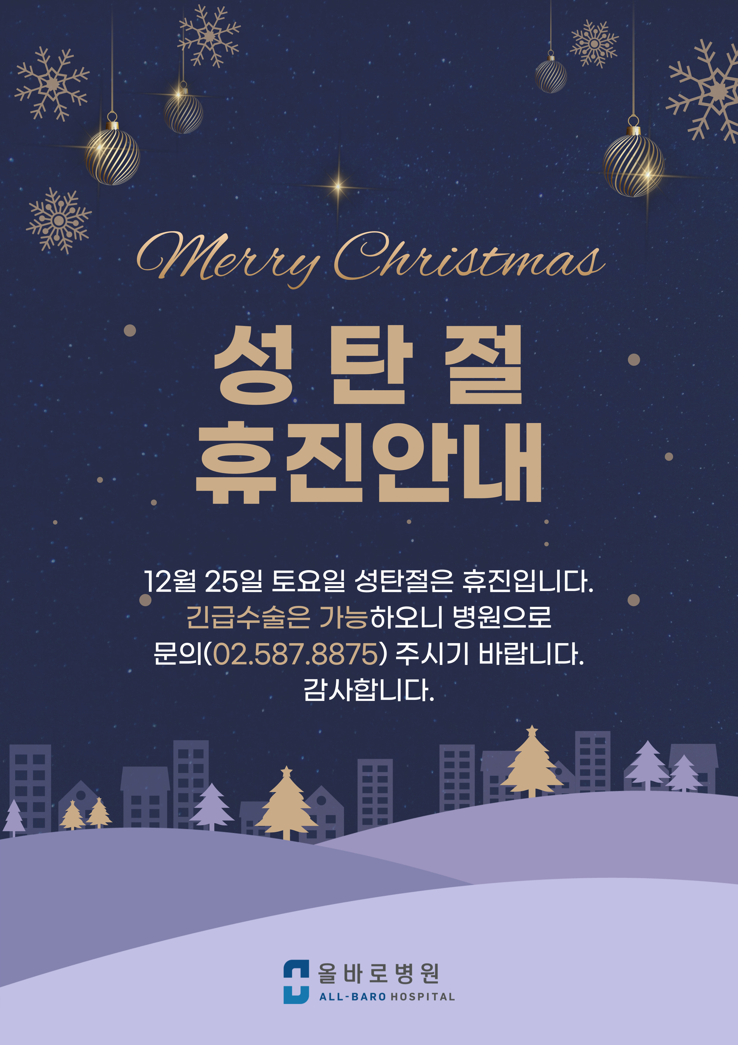 12월 25일 토요일 성탄절은 올바로병원 휴진입니다.