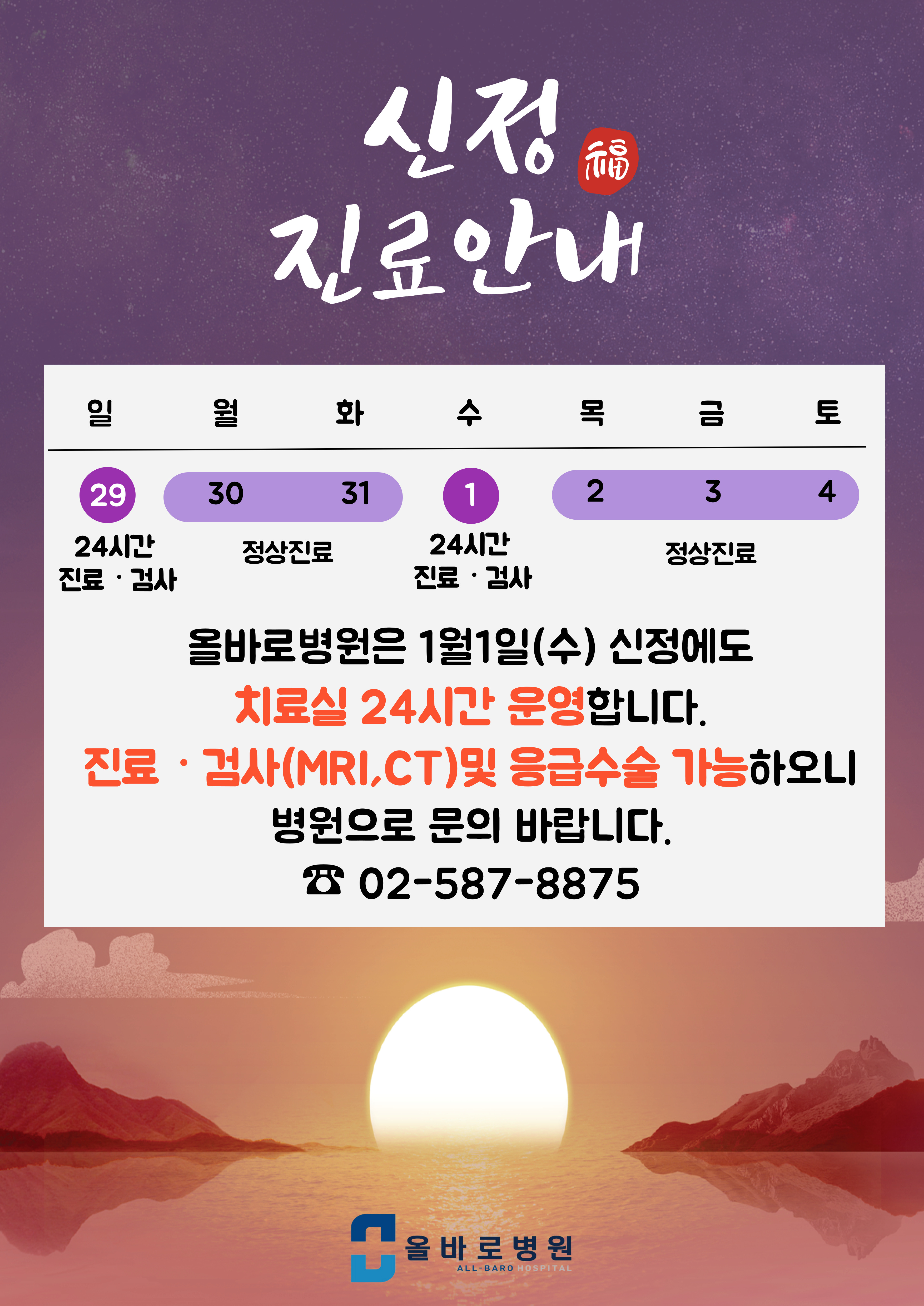올바로병원 설연휴 진료 안내
