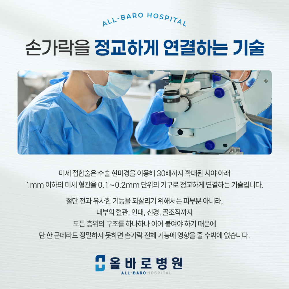 따라서 손가락 접합 수술을 받아야만 한다면, 꼭 미세 접합술이 가능한지 확인해야 합니다.