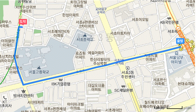 - 3호선 남부터미널역 6번출구: 서초11번 버스(남부터미널 BC카드앞 → 미켈란아파트)
